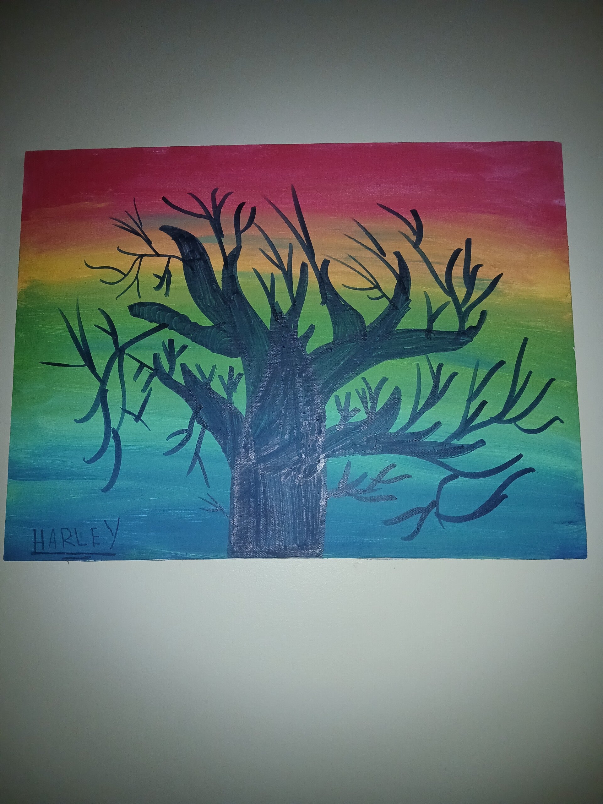 18x24 large canvas. rainbow paint with black marker tree in foreground